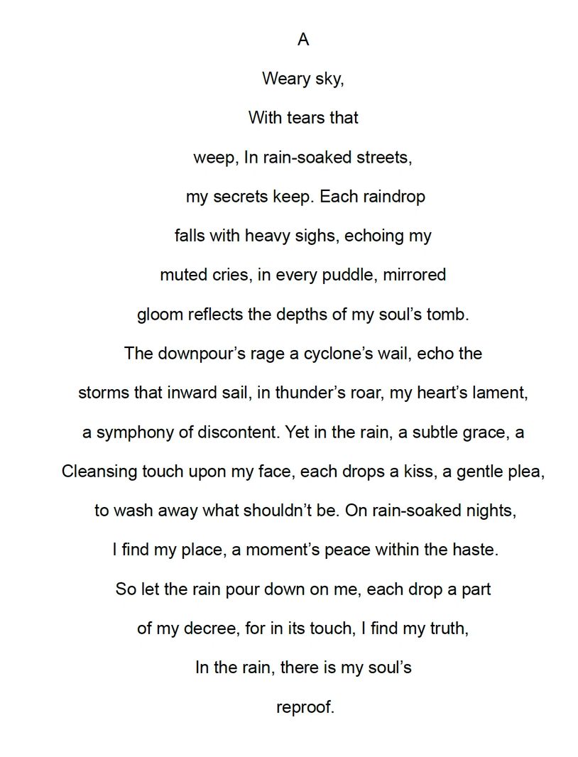 Judge Hannah Hornsey, graduate from the Communicative Sciences and Disorders at New York University and poet said, “…super strong metaphor of the river shifting from a challenge to something that the speaker uses to her advantage, made this a very successful poem.”